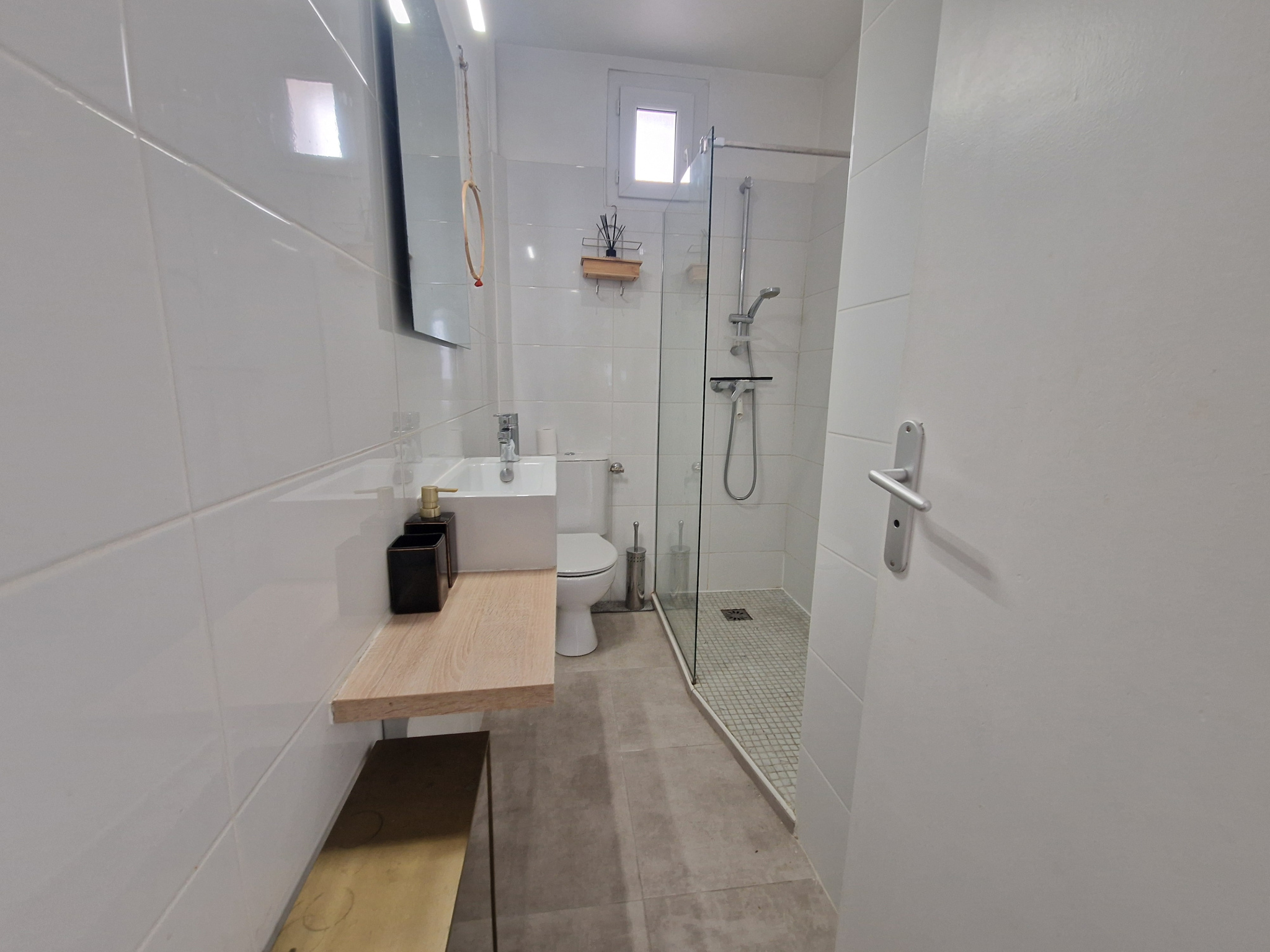 Séjour-salon, cuisine équipée et salle à manger, dégagement avec placard, chambre avec placard, salle d'eau avec wc.