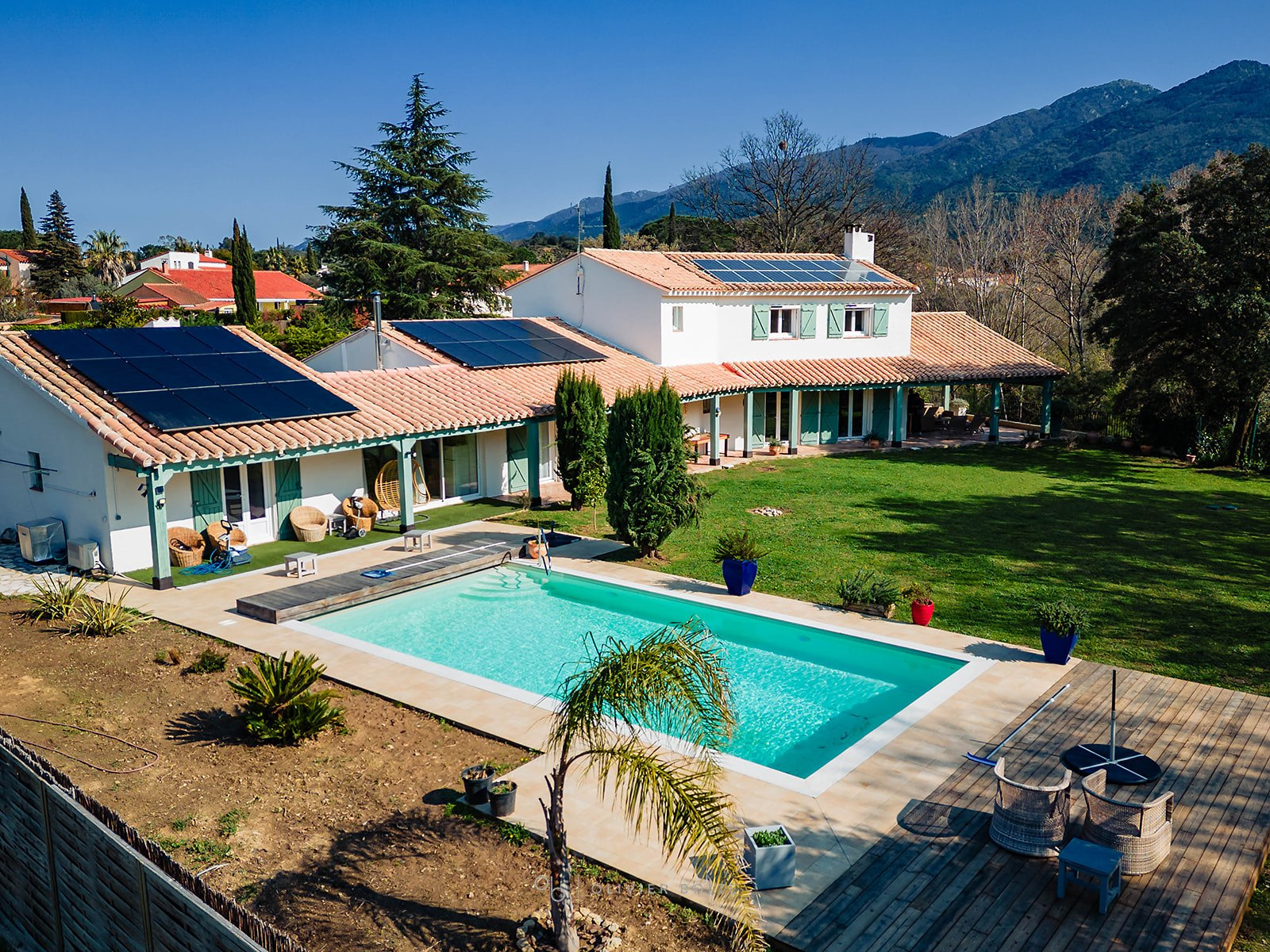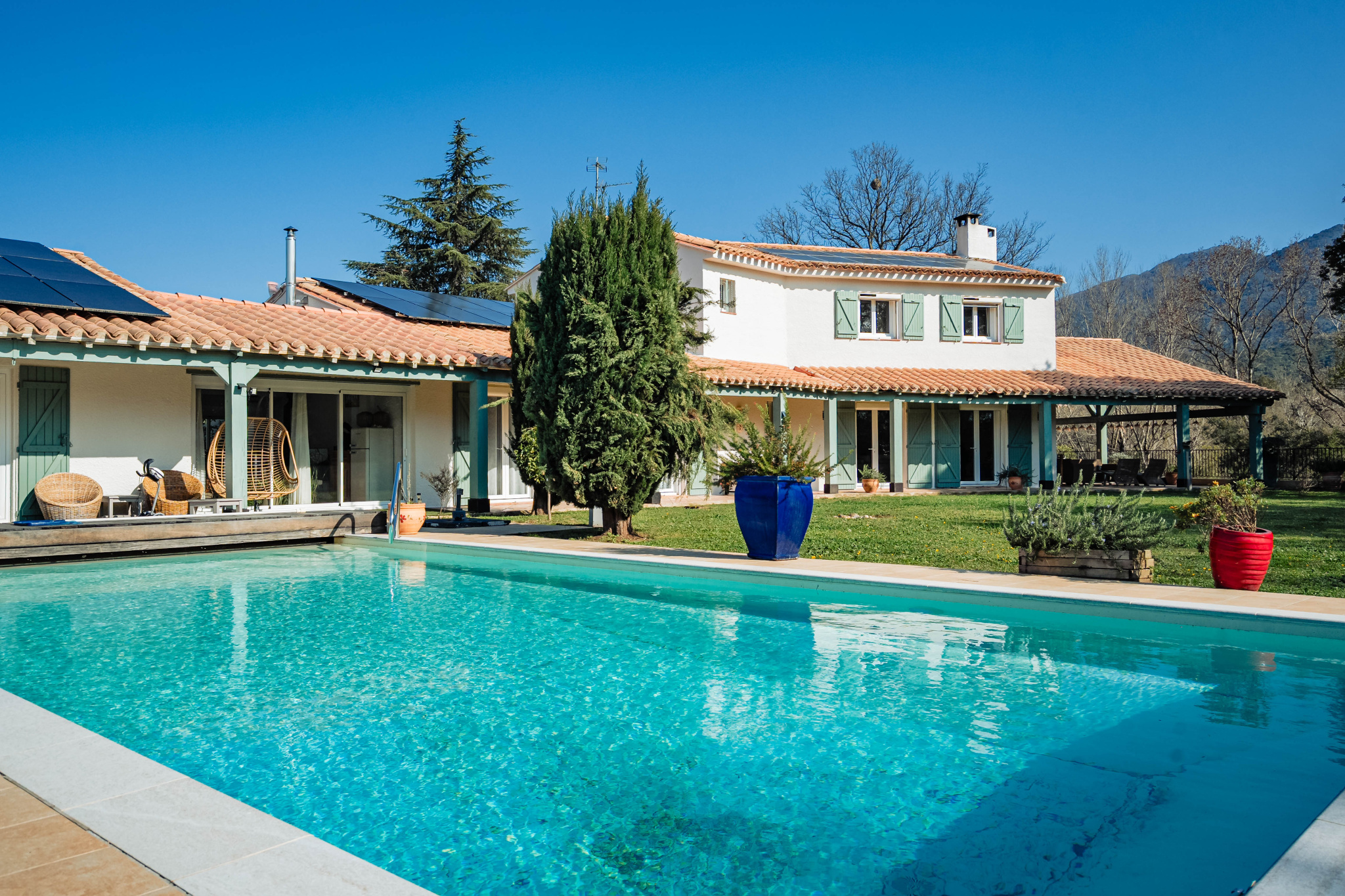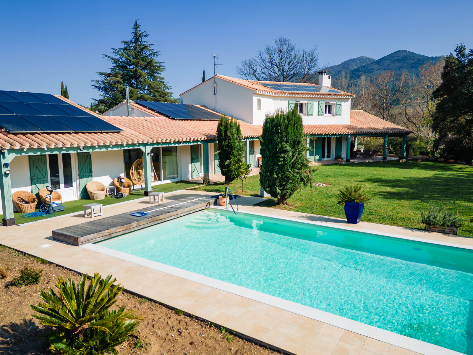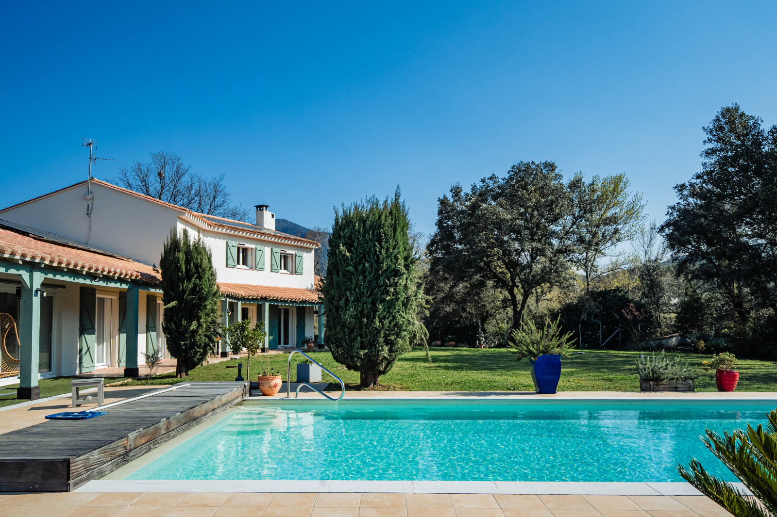 Grande piscine chauffée 10 x 5 m parfaitement intégrée au paysage pour de longs moments de relaxation face aux montagnes, agrémenté d'un terrain de pétanque pour des moments de convivialité sous le soleil de méditerranée.