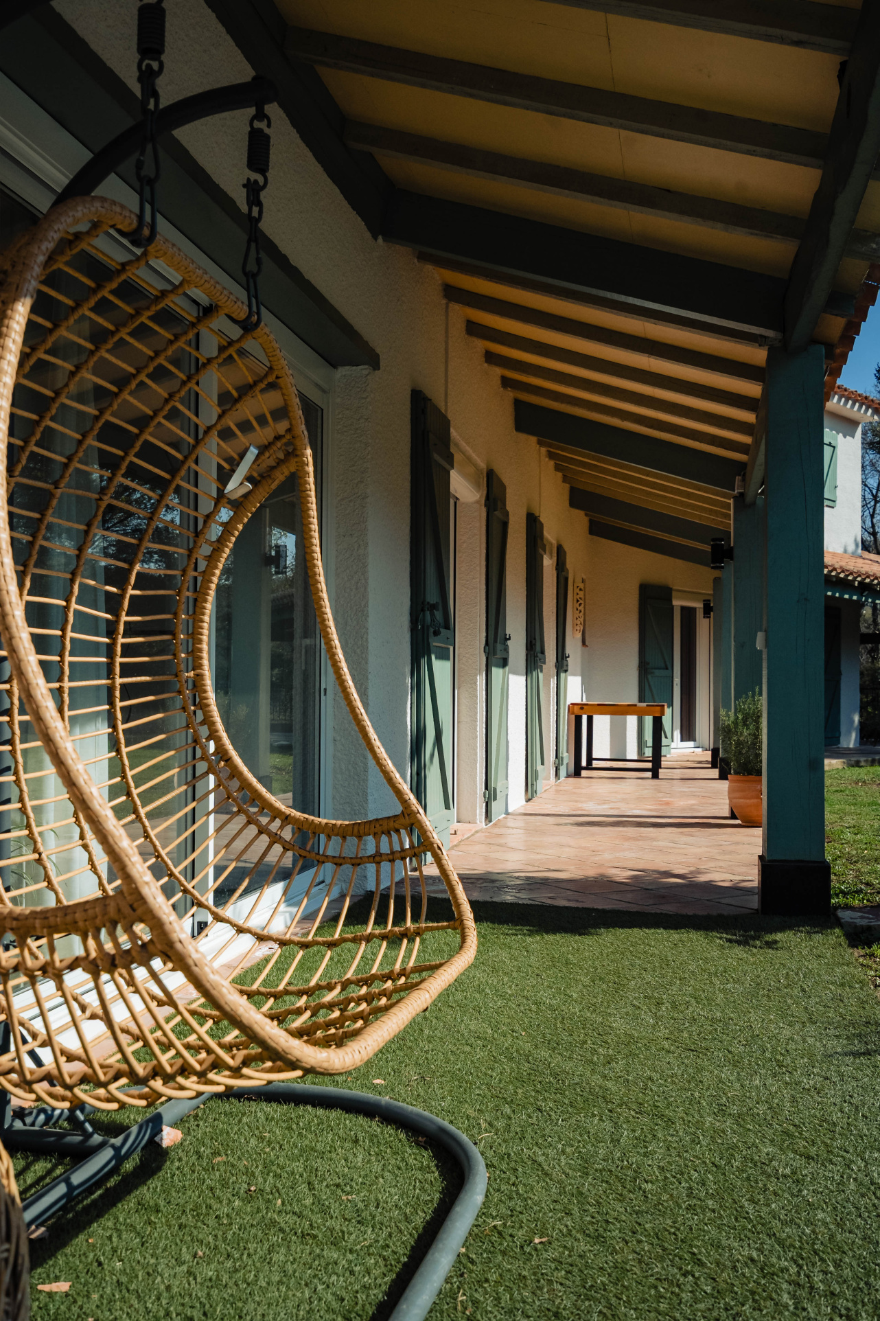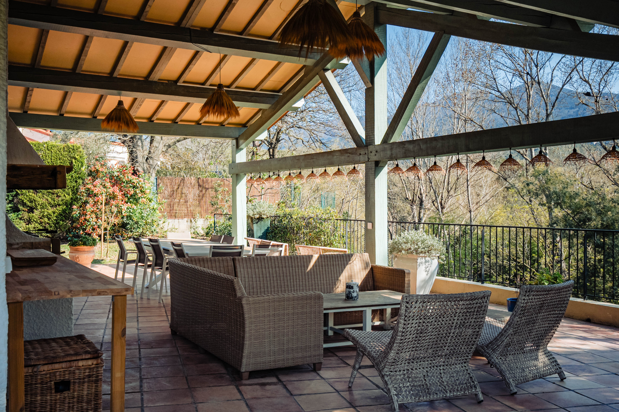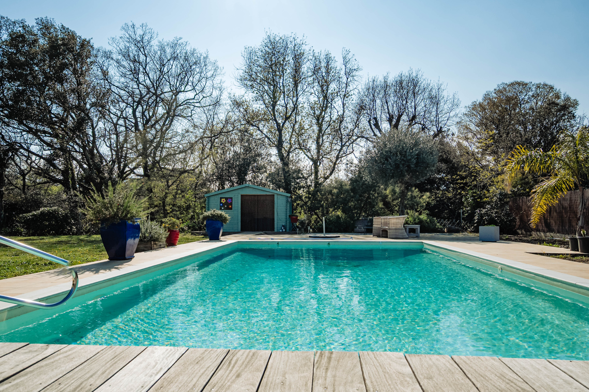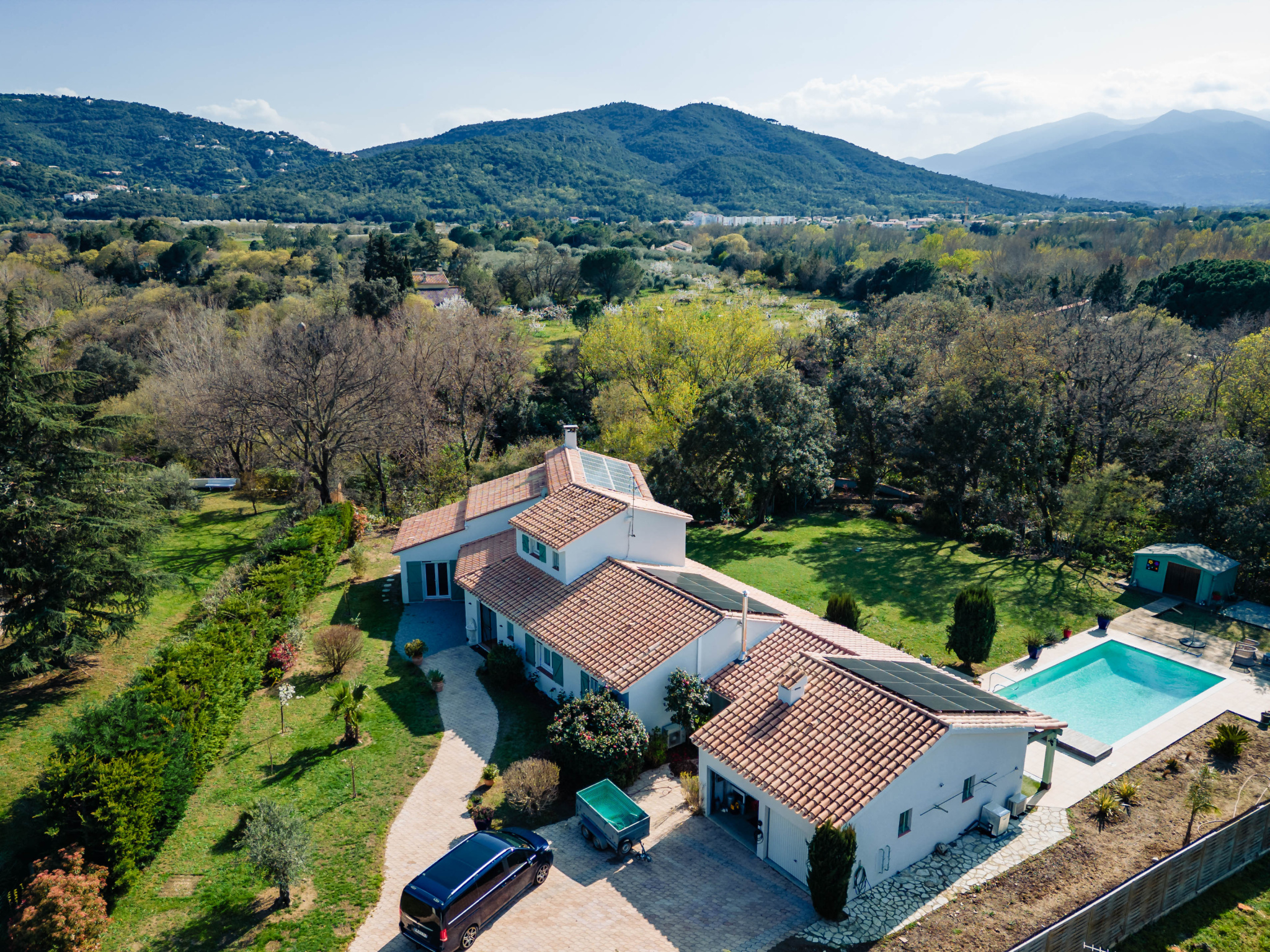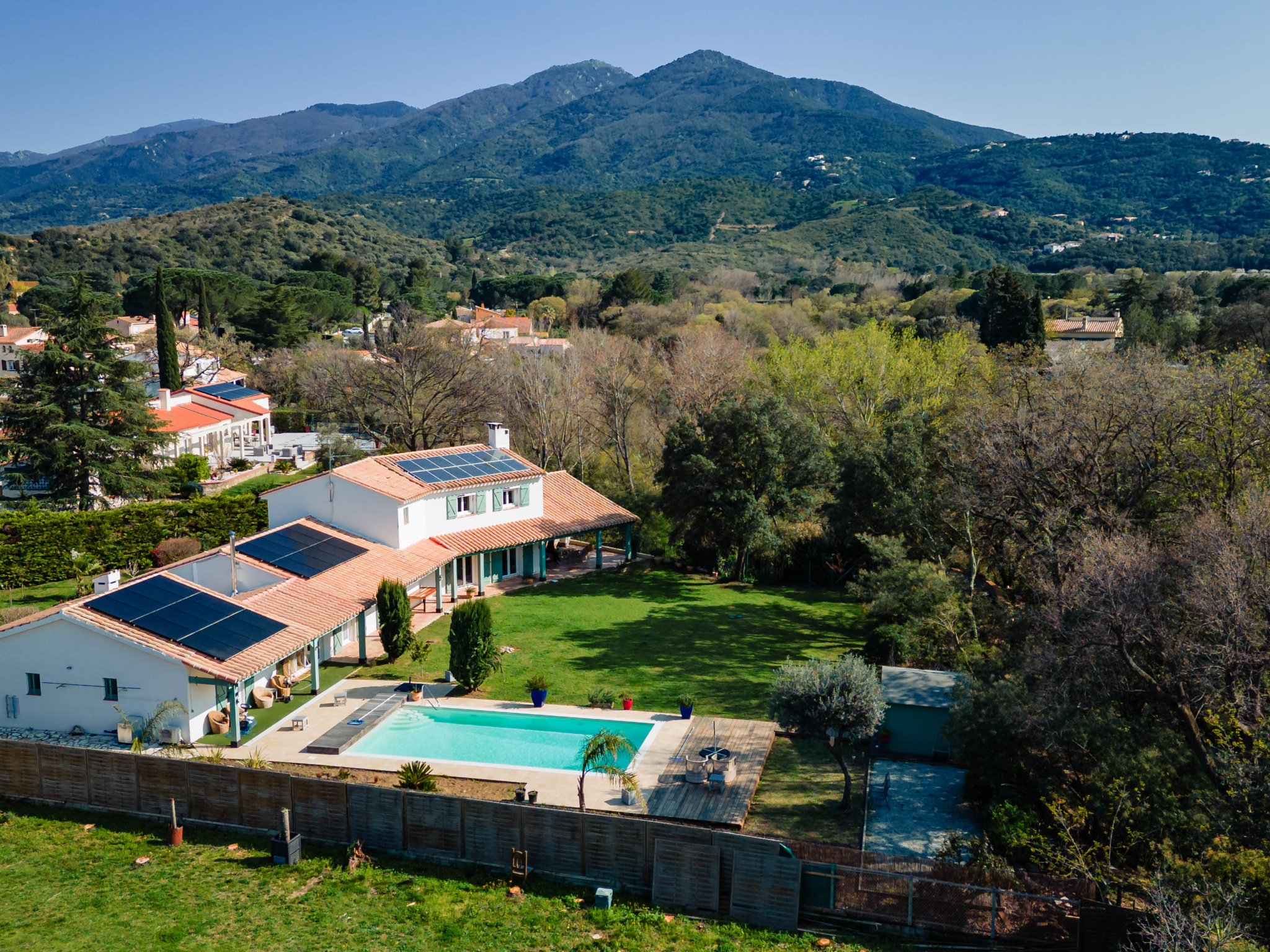 Grande piscine chauffée 10 x 5 m parfaitement intégrée au paysage pour de longs moments de relaxation face aux montagnes, agrémenté d'un terrain de pétanque pour des moments de convivialité sous le soleil de méditerranée.