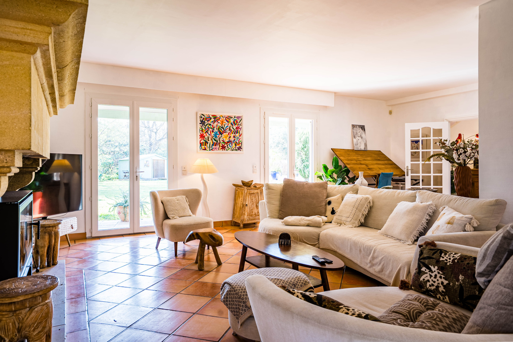 Côté intérieur, un vaste salon agrémenté d'une cheminée avec poele à bois pour une atmosphère feutrée, belle cuisine équipée, 5 chambres sapcieuses et leurs salles d'eau, sans oublier une partie indépendante pour les invités ou la famille.