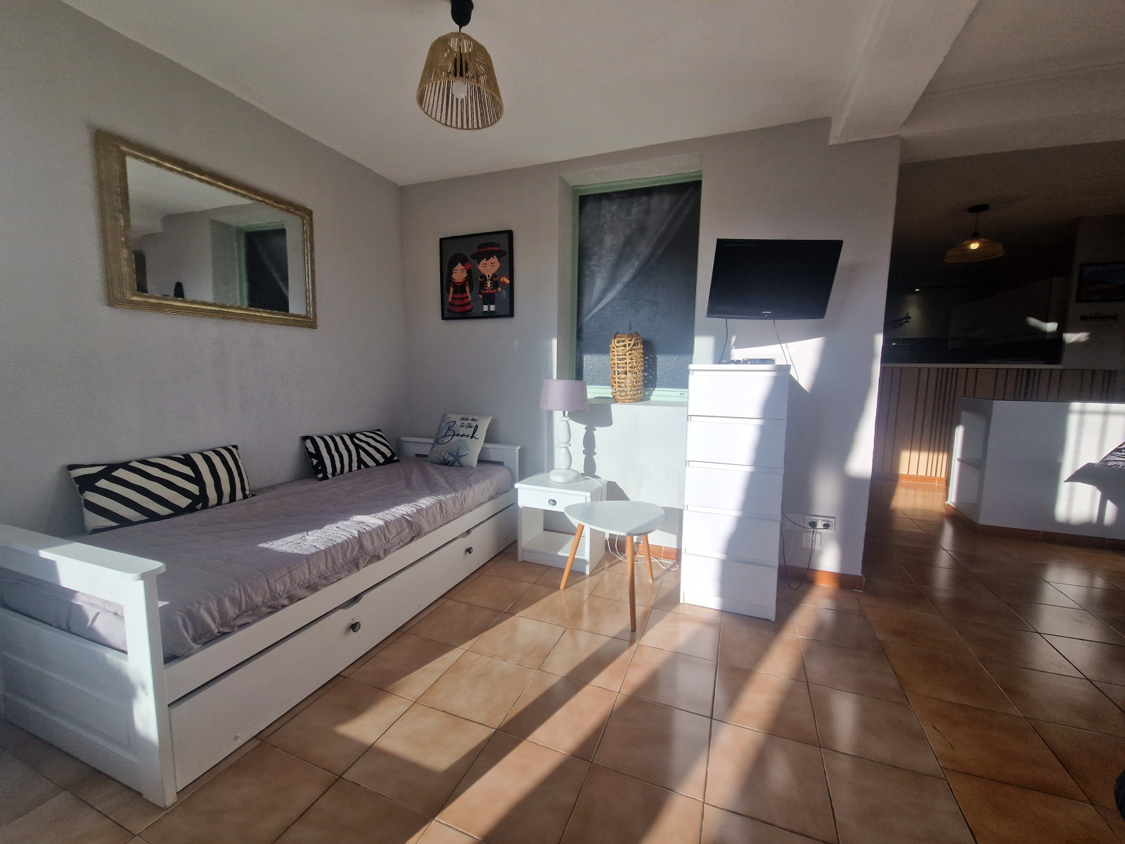 L’appartement se compose d’une chambre avec un lit double (140 x 190), d’un espace nuit avec deux lits simples (90 x 190), d’une cuisine équipée ouverte sur un séjour convivial, ainsi que d’une salle d’eau avec toilettes. Vous disposerez également de la climatisation réversible, du Wi-Fi, d’une télévision et d’un lave-linge pour un séjour en toute tranquillité.